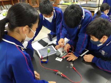 22学級は、理科の「電流と回路」の授業の様子です。直列回路の電流の大きさを調べていました。「電流が流れてないぞ?」「つなぎ方が逆になっているじゃん」と言いながら回路のつなぎ方を確認し、流れた電流の大きさを学習用タブレットに記録していました。実際に実験を行うことにより、様々な面で理解を深めることができます。