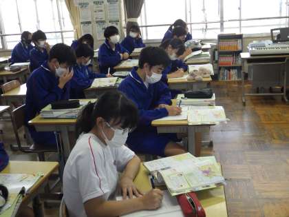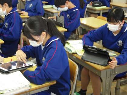 23学級は、社会の「日本の諸地域」の授業の様子です。既習した内容で大切なポイントを学習用タブレットで調べたり、ノートにまとめたりしながら再確認していました。
