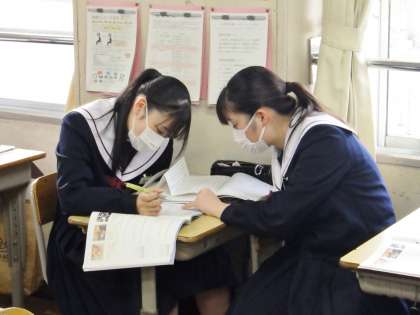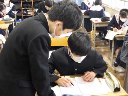31学級は、英語の授業の様子です。「ガンディーの伝記」の英文を読み、その内容についての問題を解いていました。疑問点があると、級友と考え方、解き方を確認していました。