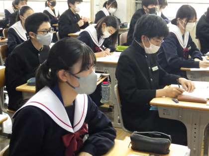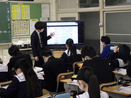 34学級は、社会の「地方公共団体の課題」の授業の様子です。デジタル教科書の映像を見ながら教師の説明を集中して聞き、地方財政の仕組みについて認識を深めていました。