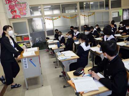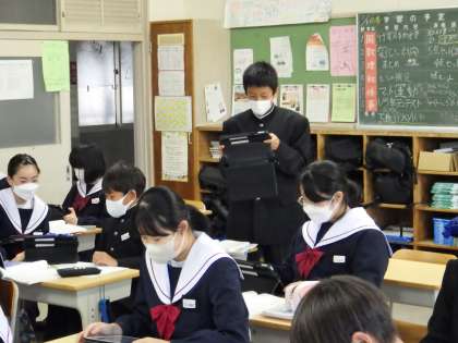 11学級は、国語の「蓬萊の玉の枝—「竹取物語」から−」の授業の様子です。難しい語句の意味を学習用タブレットで調べ、発言していました。
