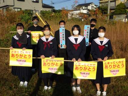 「とまってくれてありがとう運動」を行った後、生徒会と話をすると「止まってくれた運転手が笑顔でこちらを見てくれたのでうれしかった」という言葉が聞かれました。協力していただいた運転手の方々、地域の方々、ありがとうございました。