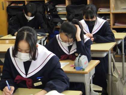 32学級は、理科の「化学変化と電池」の単元テストの様子です。時間いっぱいまで見直しを行うなど、集中して取り組んでいました。