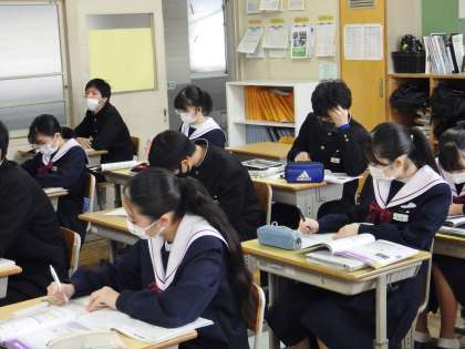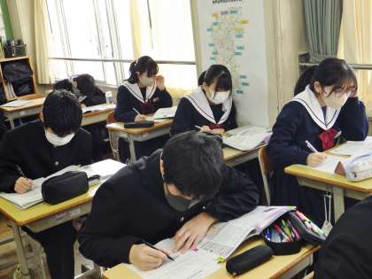 34学級は、体育の保健「エイズとその予防」の授業の様子です。エイズの特徴、予防について、教科書の資料を見ながら、学習プリントにまとめていました。