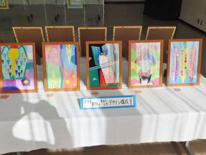 「ヤサイ・果物をもとにしたデザイン構成」の作品です。2年生が美術の時間に作成しました。