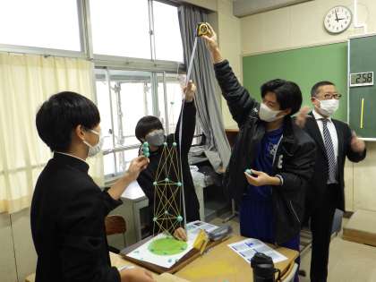 地震や風に耐えることができる構造の秘密について、クイズやパスタによるタワー模型を作りながら教えていただきました。