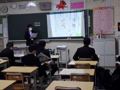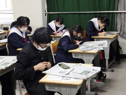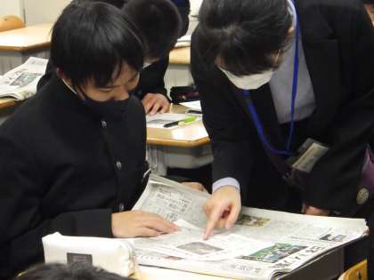 新聞社の仕事について動画で説明していただいたり、新聞の読み方について実際に新聞を見ながら教えていただきました。