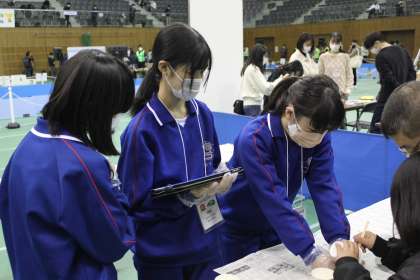 体験に来た小学生、幼児のこどもたちに丁寧にスライム作りを教えていました。小学生、幼児の子どもはとても楽しそうに体験しており、保護者の方からも温かい言葉をかけてもらい、生徒はとても充実感を感じていました。