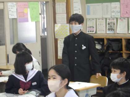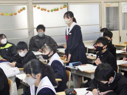 11学級は、国語の「今に生きる言葉」の授業の様子です。「矛盾」という言葉の由来を中国の故事を読み取りながら、理解を深めていました。多くの生徒が積極的に挙手し、自分の考えを堂々と発言していました。