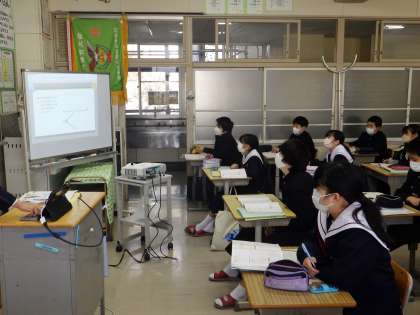 13学級は、数学の「移動と作図」の授業の様子です。デジタル教科書の映像で垂直二等分線のかき方を確認した後、垂直二等分線をノートに書きながら、確認していました。