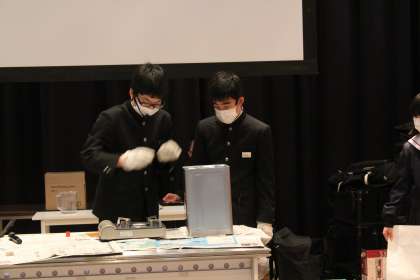 生徒は、今までの練習の成果を発揮し、緊張しながらも堂々と発表していました。リハーサル後、とよた科学体験館の所員の方から、本番の発表に向けて、助言をいただきました。本番の発表に向けて、助言していただいたことを生かしていきたいと思います。