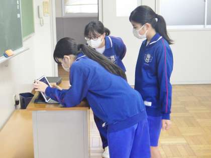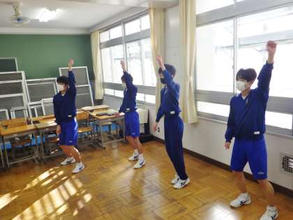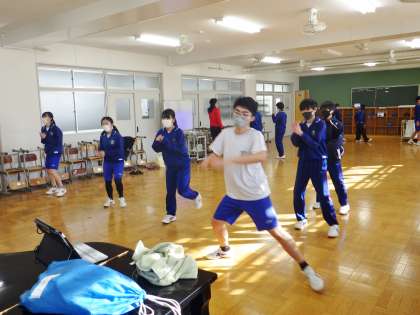 31学級は、体育の「ダンス」の授業の様子です。学習用タブレットのダンスの映像を見ながら繰り返し練習していました。また、動きの合わせ方などをグループで話し合いながら楽しく行うなど、人間関係の良さを感じました。