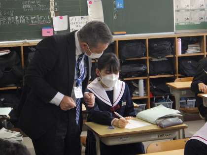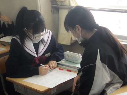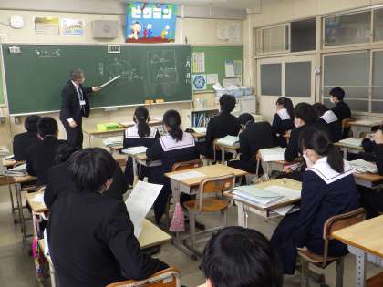32学級は、数学の「円の性質」の授業の様子です。練習問題を解いている際に疑問点があると、教師に聞いたり、級友と確認したりと、積極的に取り組んでいました。
