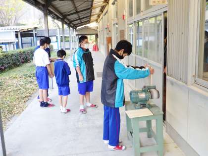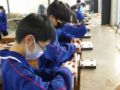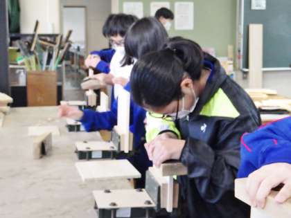 12学級は、技術の「オリジナル木工製作」の授業の様子です。切削(かんながけ・ベルトサンダー)の作業を行っていました。「かんながけは、けっこう難しい!」と呟きながら、一生懸命取り組んでいました。