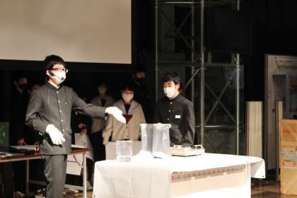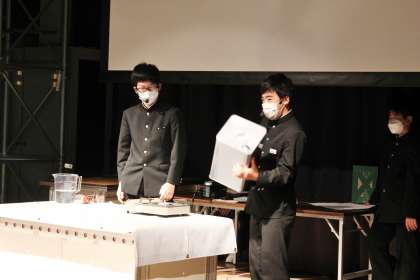 「大気圧で一斗缶をつぶす実験」を発表している様子です。