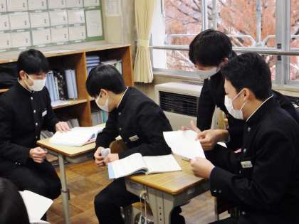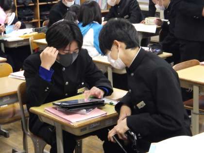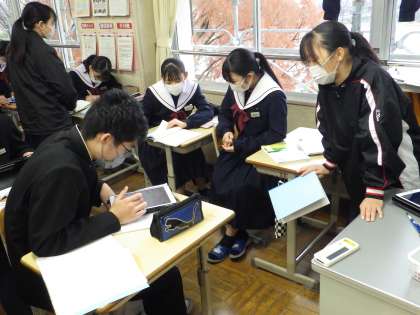 31学級は、国語の授業の様子です。万葉集、古今和歌集、新古今和歌集の中から和歌を一つ選び、同じ和歌を選んだ級友と、内容について話し合っていました。