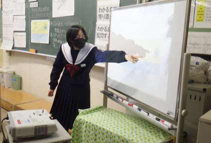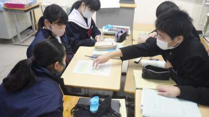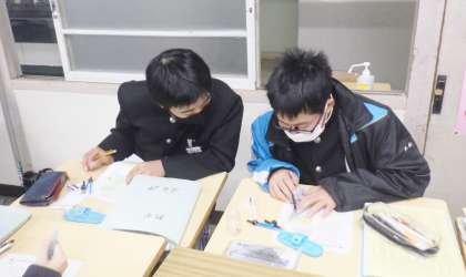 1限に、13学級で数学の研究授業を行いました。授業では、コンパスを使った作図を活用して応用問題に取り組みました。一人では考えが思い浮かばなかった生徒も、班の仲間と相談しながらコンパスや定規を使って試行錯誤をする中で、正しい解き方を見つけることができました。最後にもう一問類題を解いて、全員が理解できているかを確認しました。今後も、全員が分かるまで一人一人に寄り添う授業づくりをめざしていきます。