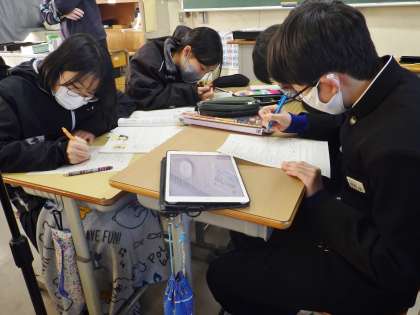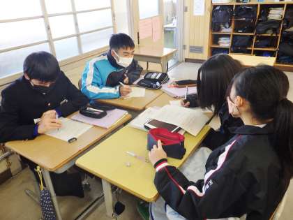 12/19(月) 授業の様子です(2年生) 1 公開日 2022/12/19 更新日 2022/12/19 お知らせ 2年生の授業の様子です。 21学級は、英語の「A Glass of Milk」の授業の様子です。学習プリントの問題を班で話し合って解きながら、本文の内容の理解を深めていました。