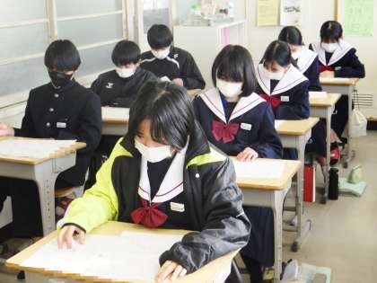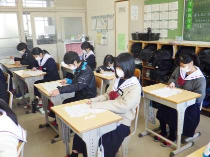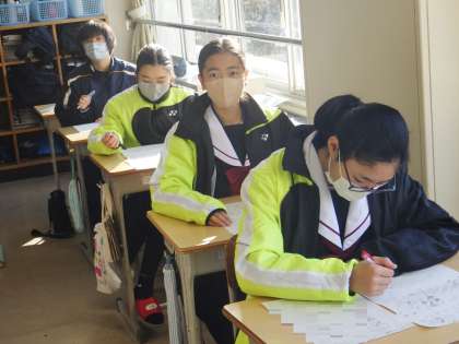 12学級は、数学の授業の様子です。「平面図形」の単元テストを返却後、間違いが多かった問題を中心に解説を行っていました。解説を集中して聞き、解き方、考え方を確認していました。