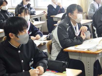 1/24(火) 授業の様子です(3年生) 3 公開日 2023/01/24 更新日 2023/01/24 お知らせ 33学級は、社会の「財政の役割と課題」の授業の様子です。社会資本や公共サービスについて、教師の話を集中して聞き、大切なポイントをノートにまとめながら理解を深めていました。
