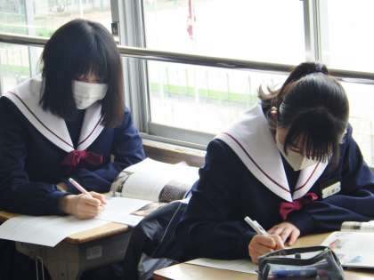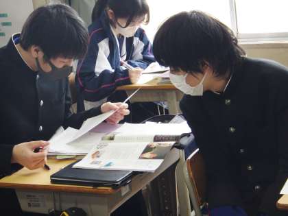 34学級は、英語の「A Graduation Gift from Steve Jobs」の授業の様子です。本文に関する問題を解いた後、教師や級友と説き方・考え方について確認していました。
