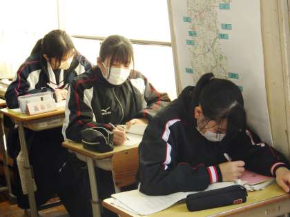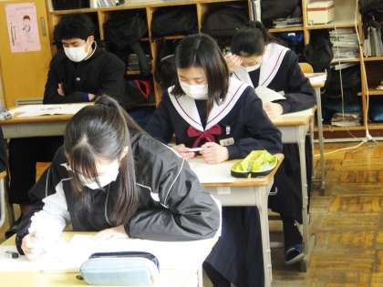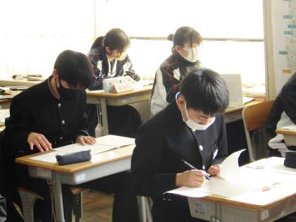34学級は、国語の授業の様子です。入試に向けた対策プリントの問題を集中して解いていました。