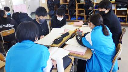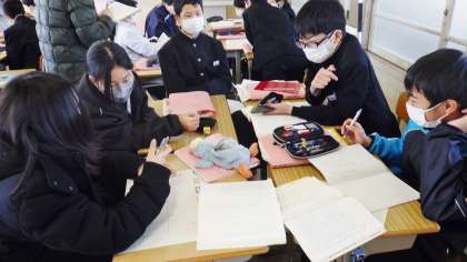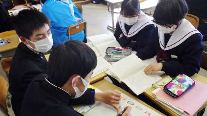 21学級は、国語の「走れメロス」の授業の様子です。メロスの心情が場面ごとにどう移り変わっていったのか、班で話し合っていました。