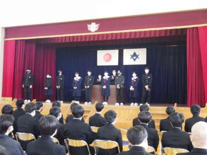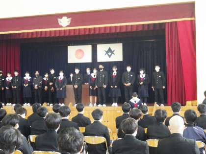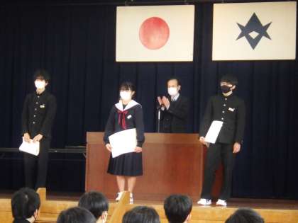全校集会で表彰を行っている様子です。