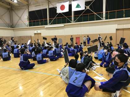 3/9(木) 自然教室1日目です 公開日 2023/03/09 更新日 2023/03/09 お知らせ 学年レクリエーション、夜の部です。 第1回戦はクイズ大会。 15問の3択クイズを、班で協力して考えます。 優勝は24学級! 訂正があります。 昼の学年レクリエーション2回戦の「ソリリレー」優勝学級は、22学級でした。 2年