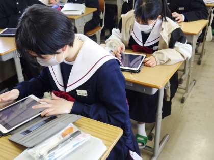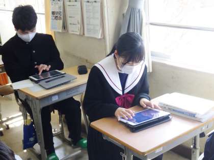 21学級は、家庭科の「購入・支払いと生活情報」の授業の様子です。店舗販売・無店舗販売の利点と問題点を学習用タブレットに記入した後、商品の購入の行い方について話し合っていました。