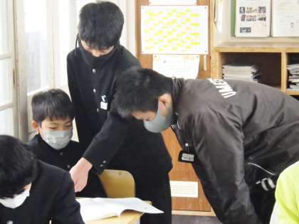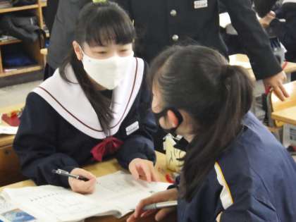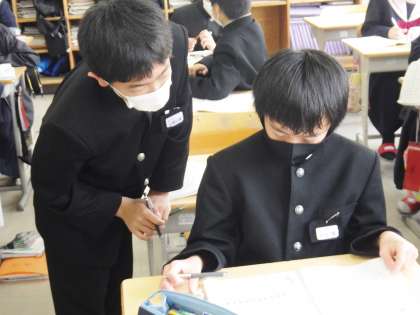 11学級は、国語の「ことばのきまり」の授業の様子です。品詞の分類について学習していました。疑問点があると、級友と確認しながら理解を深めていました。