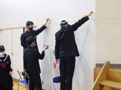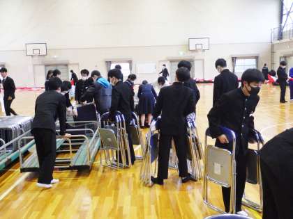 3年生の有志が入学式会場の片づけを行っている様子です。