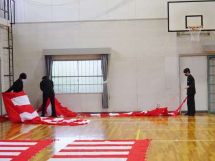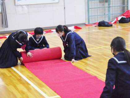 3年生の有志が入学式会場の片づけを行っている様子です。