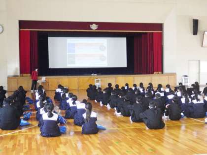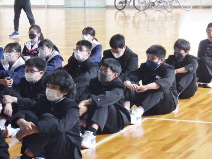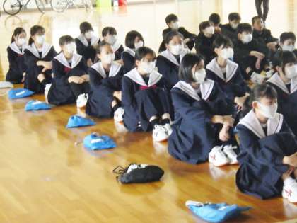 本日、豊田市交通安全学習センターの方が2名来校し、1年生に交通安全について話をしました。自転車事故が起こりやすい場面等を映像で確認したり、自転車の安全な乗り方について生徒に実際に自転車を運転してもらいながらわかりやすく説明したりと、安全について深く考えることができた交通安全講習会となりました。