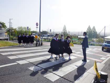 この通りは、朝の交通量が多いこともあり、横断歩道を渡るときに車に気をつける必要があります。そのため、毎朝、教員が登校指導を行っています。