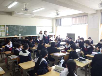 4/19(水) 授業の様子です(1年生) 3 公開日 2023/04/19 更新日 2023/04/19 お知らせ 13学級は、英語の授業の様子です。アルファベットの練習をした後、英語で自己紹介を行っていました。明るい雰囲気で楽しそうに自己紹介していました。また、自己紹介を聞いている生徒も、発表者の方を見て頷きながら聞くなど、聞く姿勢もとてもすばらしかったです。