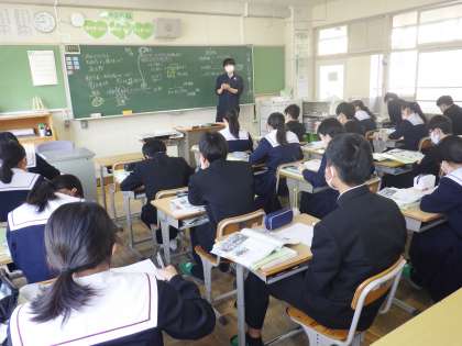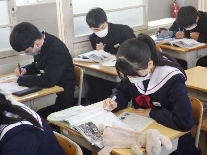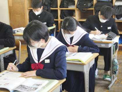 33学級は、社会の「ロシア革命」の授業の様子です。「資本主義と社会主義の違い」について、教師の話を集中して聞いた後、学習プリントにまとめていました。