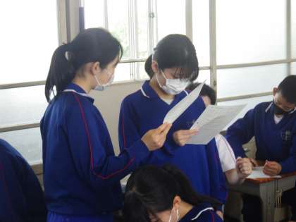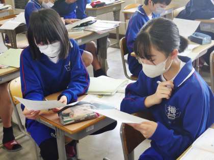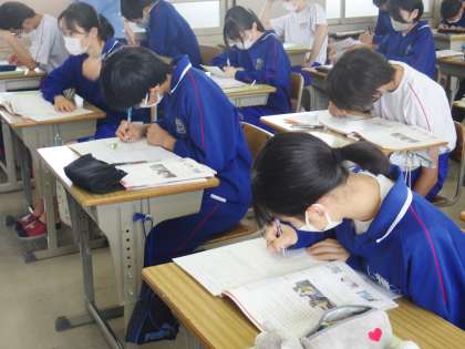 21学級は、英語の「未来形 —will+動詞の原形—」の授業の様子です。練習問題を解き、疑問点があると級友と確認し理解を深めていました。