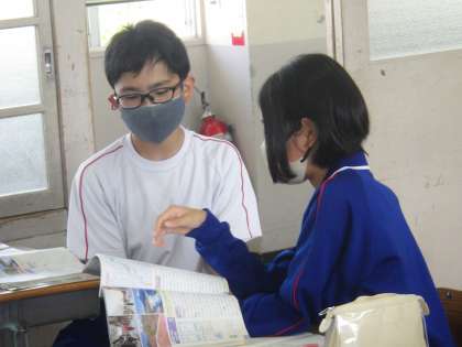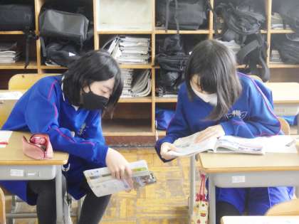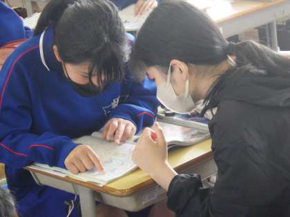 23学級は、社会の「日本のさまざまな地形」の授業の様子です。日本の特徴的な雨温図を見て、「これは気温が高いから沖縄だな。逆にこれは気温が低いので北海道だ」「これは、ちょっと難しい。降水量から考えればいいのかな?」など、級友と積極的に話し合っていました。