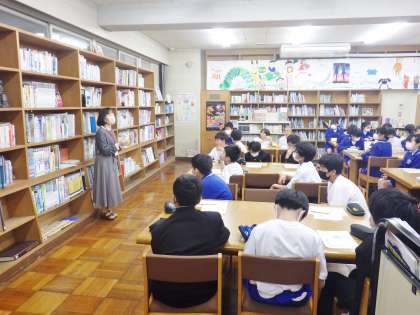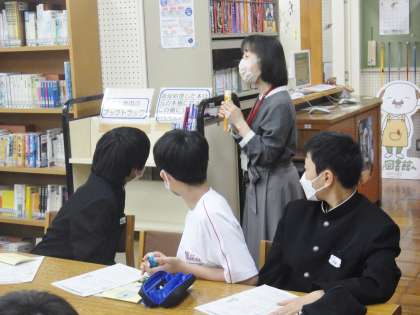 司書さんが、図書館の利用の仕方について1年生に説明を行いました。生徒たちは図書室の利用時間や借りられる期間等を聞いた後、実際に本の貸出を行いました。