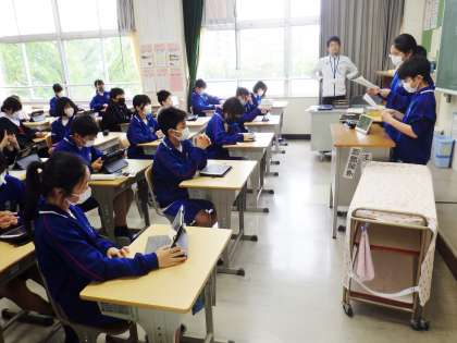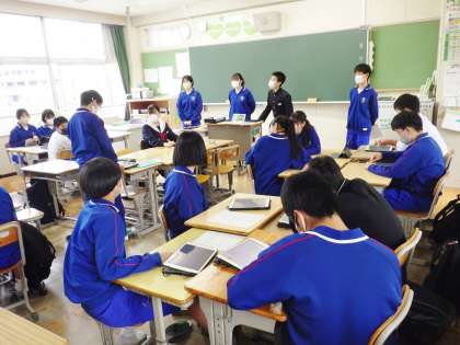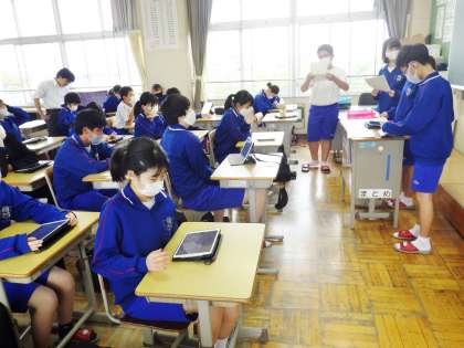 学級の各委員会の生徒が、タブレット画面に映し出された各委員会の情報を伝達しました。委員会の活動を活発に行い、学校の活力を高めていきましょう。