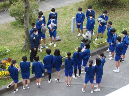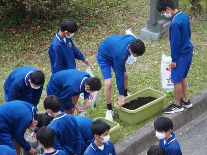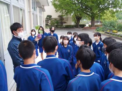 32学級は、技術の「栽培実習」の授業の様子です。夏野菜の苗を植えていました。植え終わった後、栽培の行い方について確認していました。