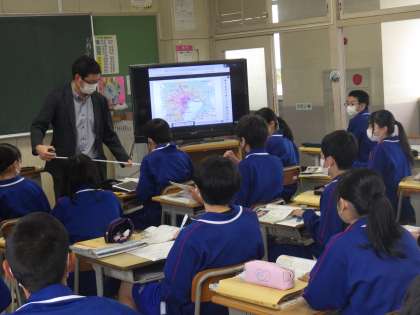 21学級は、社会の「資源・エネルギーから見た日本の特色」の授業の様子です。デジタル教科書の資料を見ながら、地価の高い場所を確認していました。一坪の値段を聞いて、「へぇ〜、そんなに高いんだ!」という呟きが聞こえてきました。