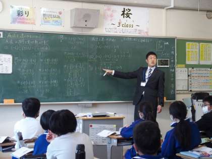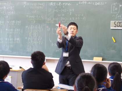 正の数、負の数の計算をする上で、どのようにしたら間違えずに計算できるかを考え、教科担任の先生からは「マイナスロケット理論」の説明がありました。