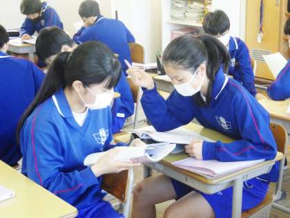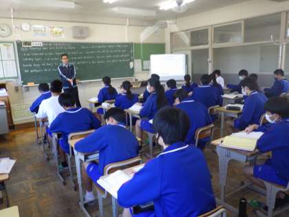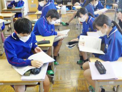 34学級は、英語の授業の様子です。「that」を使った新しい文法を活用して、本文の読み取りをペアで行っていました。