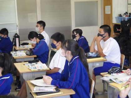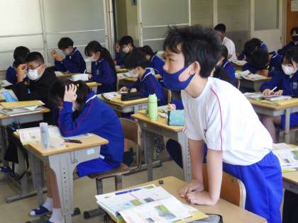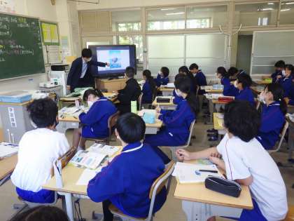 13学級は、社会の「日本の領域の特色」の様子です。デジタル教科書の映像を見ながら、日本の領域について確認していました。また、積極的に自分の考えを発表していました。