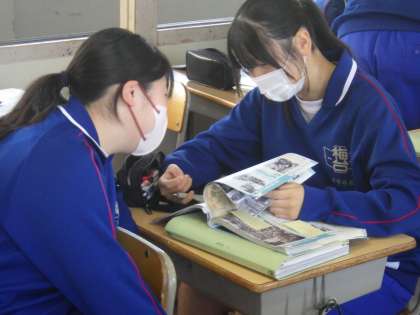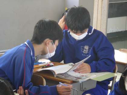 33学級は、社会の「昭和恐慌と政党内閣の危機」の授業の様子です。「政党内閣?忘れちゃった」という生徒の呟きが聞こえてきたので、政党内閣について確認していました。