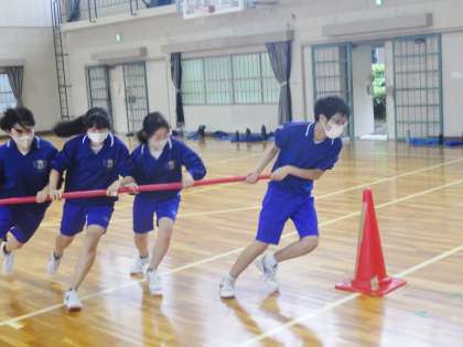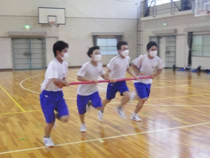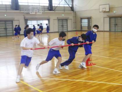 33学級は、体育の授業の様子です。体育館で体育祭種目の「台風の目」の動きを確認していました。生徒の「明日、体育祭がやれるといいな」という呟きが聞こえてきました。