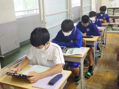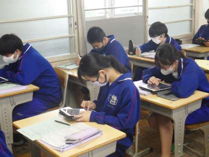 34学級は、英語の授業の様子です。自分の好きな有名人の魅力を英語で紹介する際に活用する資料を学習用タブレットで作成していました。