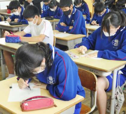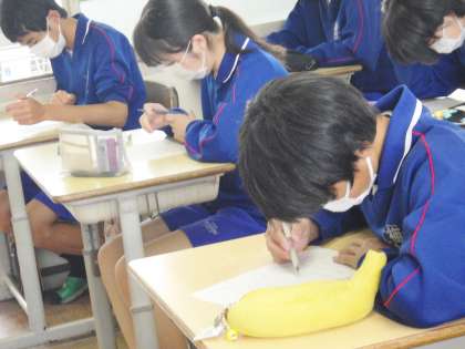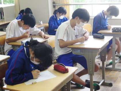 テスト・教育相談週間です。3年生が朝の学習を行っている様子です。リーダー会が作成したテストに向けての学習プリント(社会)を集中して解いていました。